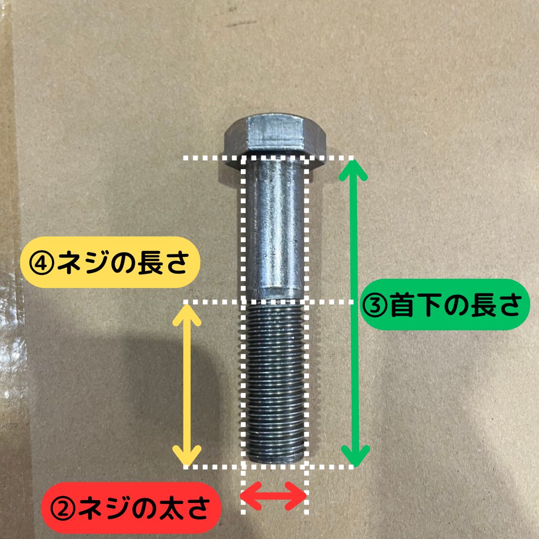 サイズを伝えるときは①規格、②ネジの太さ、③首下の長さ、④ネジの長さを伝えましょう!