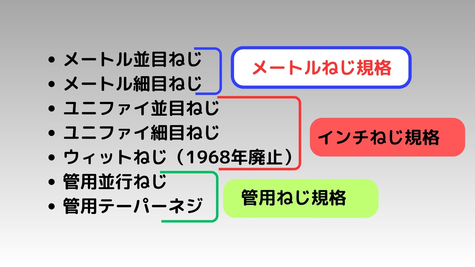 そして、皆さんがひとまず覚えておけばいいのはメートルねじ規格になります。