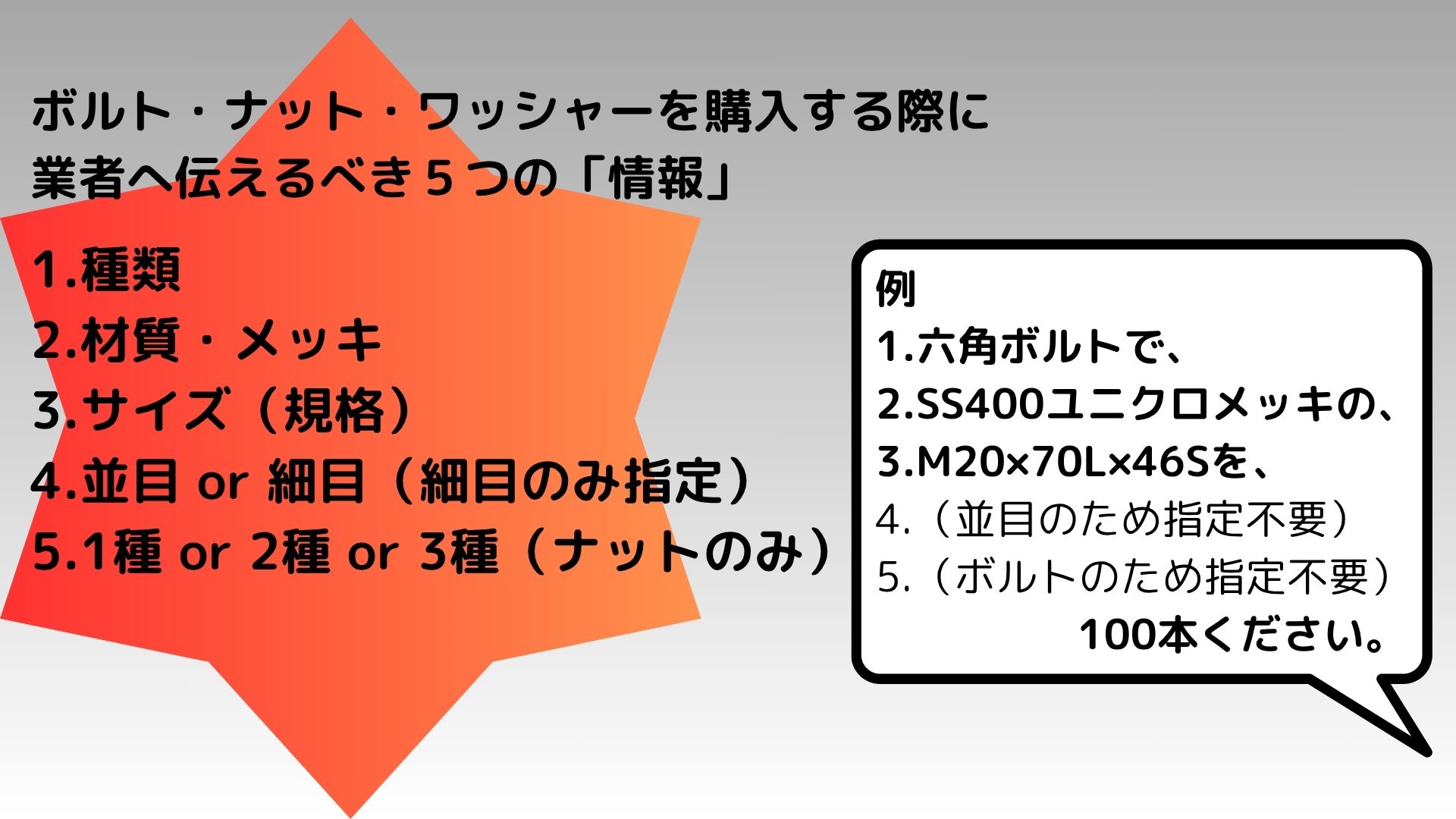 今回はボルト、ナット、ワッシャーを買うときに伝えるべき「情報」を解説しました。