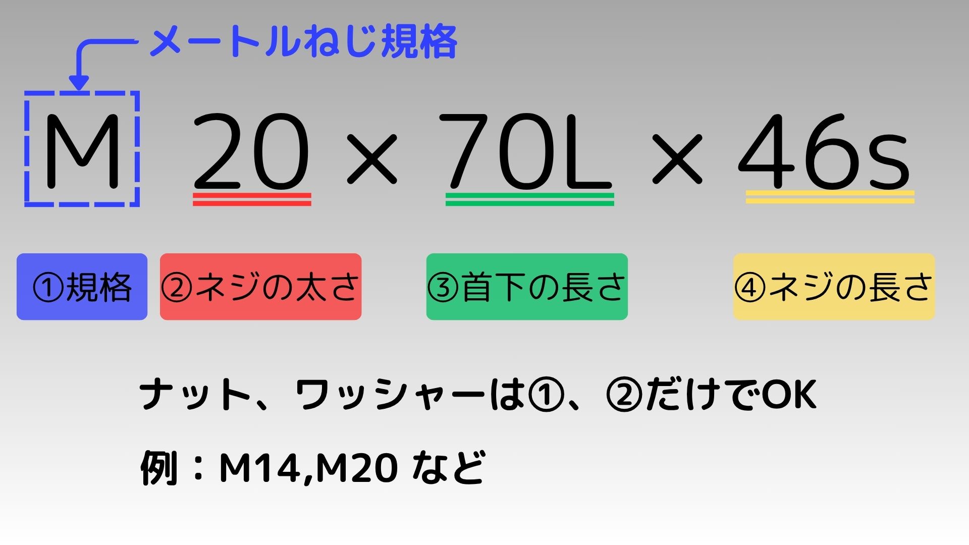 また、ナット、ワッシャーは③首下の長さと④ネジの長さは不要のため、①規格「M」と②ネジの太さのみでOKになります。(例:「M14のナットください」、「M20の平ワッシャーください」)