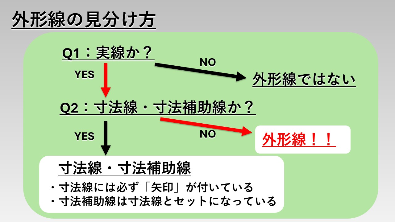 外形線を見極めるポイントは、「実線の中で、寸法線・寸法補助線ではないもの」を探すことです。