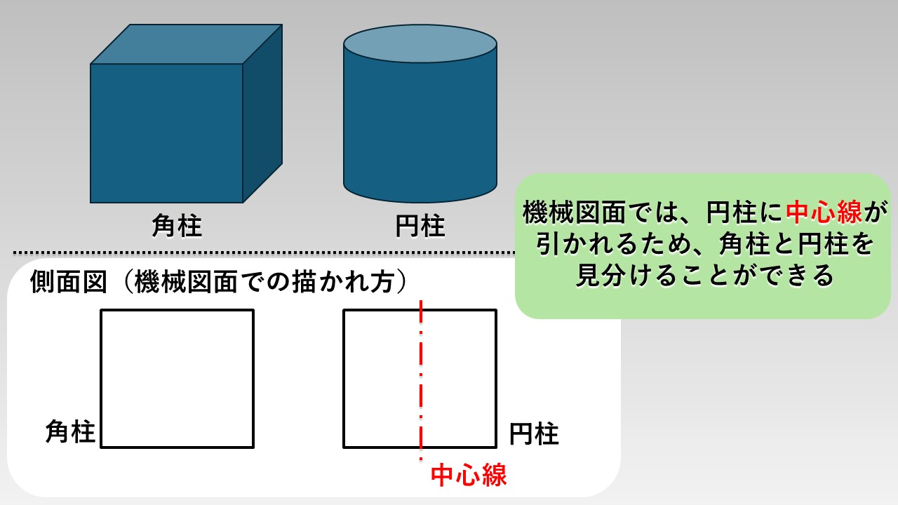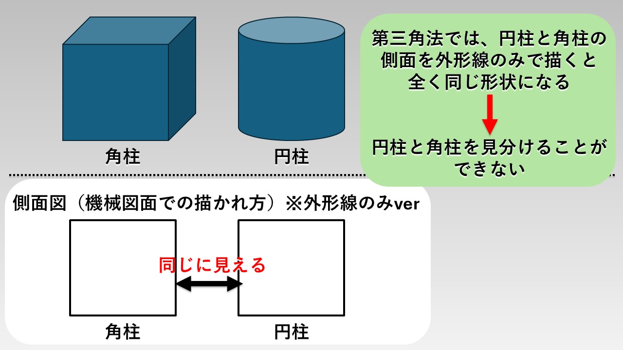 というのも、第三角法では、下図のように真横から見ると角柱も円柱も同じ「四角形」に見えてしまいます。