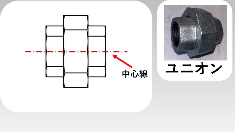 他にも、例えば配管継手のユニオンは機械図面で下図のように描かれますが、中心線があることでユニオンが円形であることが読み取れます。
