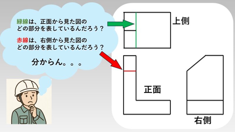 例えば、下図のように「正面から見た図のこの線が、右側から見た図のどの部分を表しているか?」という感じです。