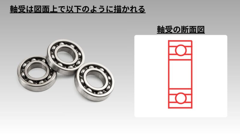 - 軸受の断面図では、下図のような形状で描かれます。