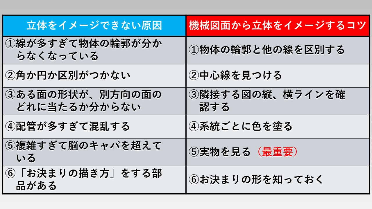 初心者が「立体をイメージできない6つの原因」と、それぞれの対策となる「機械図面から立体をイメージする6つのコツ」が下記になります!