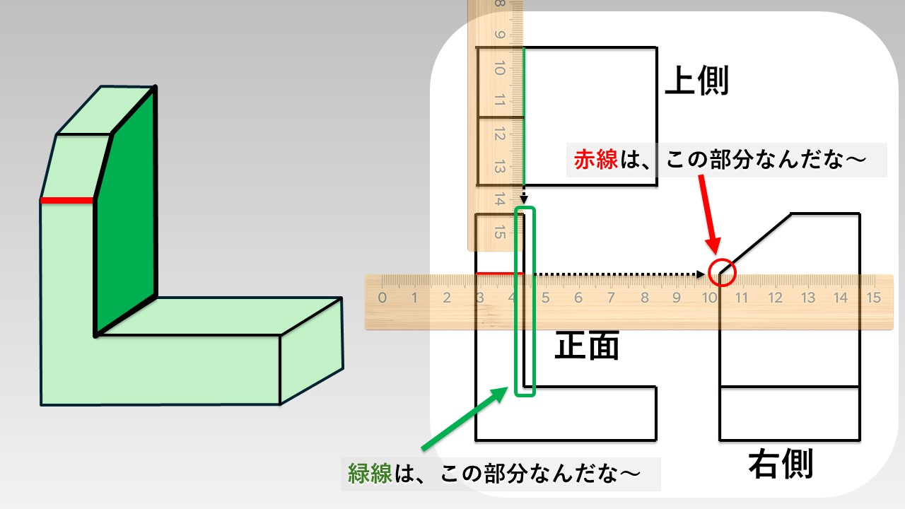 下図のように、「正面図の赤線」に定規などを当てて横にスライドさせてみてください。定規を伸ばした先にある点や線が、対応する箇所になります。