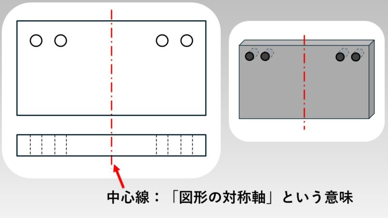 中心線は下図のように「図形の対称軸」として使用される場合もあるため、「中心線がある=100%円形」とは限りません。あくまで、「中心線があるから、円形かもしれないな」と疑う程度にし、別方向から見た面の形状を確認するなどして、円形であるかを総合的に判断するようにしましょう!