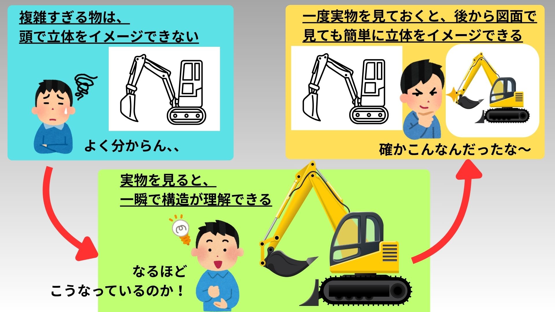 - 一度実物を見たことがあるものは、後から図面で見ても簡単に立体をイメージできるようになる