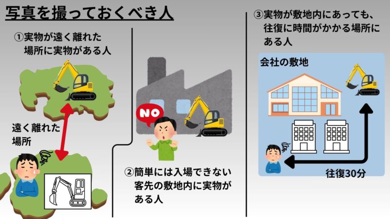 こういう環境で働いている方は、再び実物を見に行くのにかかる「手間」も「時間」も非常に大きくなるため、大量の写真を撮っておくことで、効率的に業務を進めましょう!