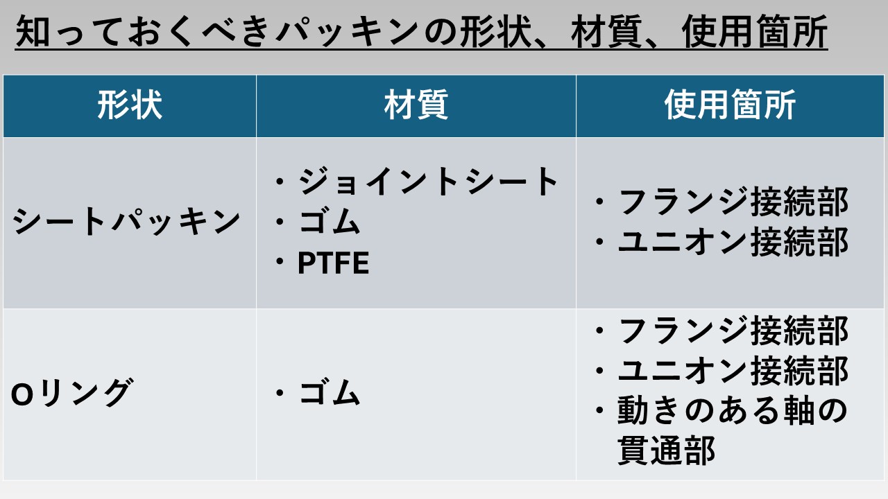 〇知っておくべきパッキンの使用箇所、形状、材質