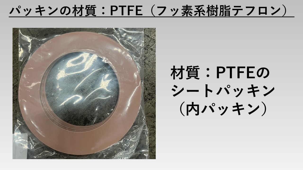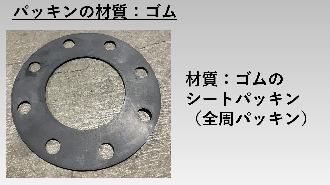 - シートパッキンの材質としては、(後ほど詳しく説明しますが、)主に「ジョイントシート」「ゴム」「PTFE」がある。