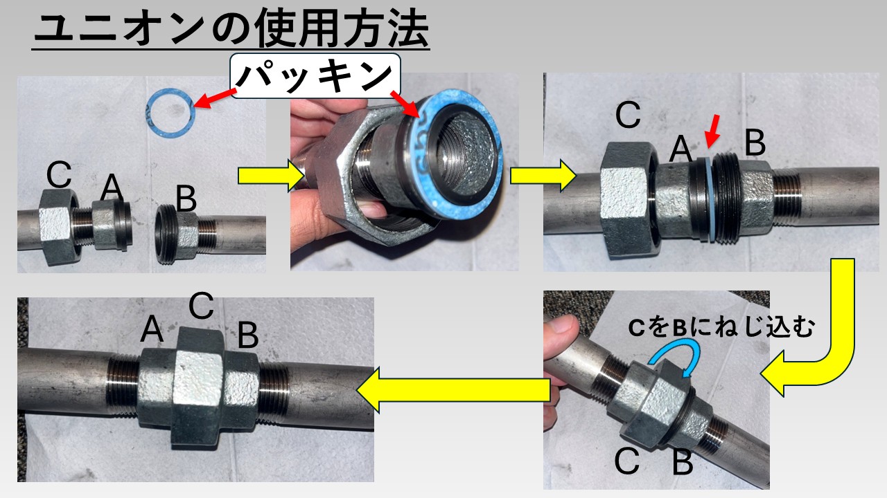 ユニオンは、3つの部品から構成されている継手です。少し複雑ですが、上図のようにAとBをCで固定するように接続します。