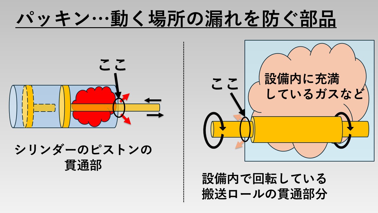 - 例えば、シリンダーのピストンの貫通部分や設備内で回転している搬送ロールの貫通部分など。(下図参照)