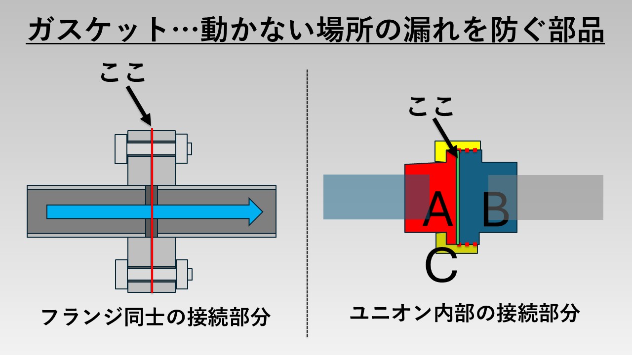 この時に、AとBの間には必ずパッキンが必要になります。Cでがっちり固定はできますが、どうしても微小な隙間ができ、そこから漏れ出てきてしまうため、パッキンでその隙間を埋める必要があります。