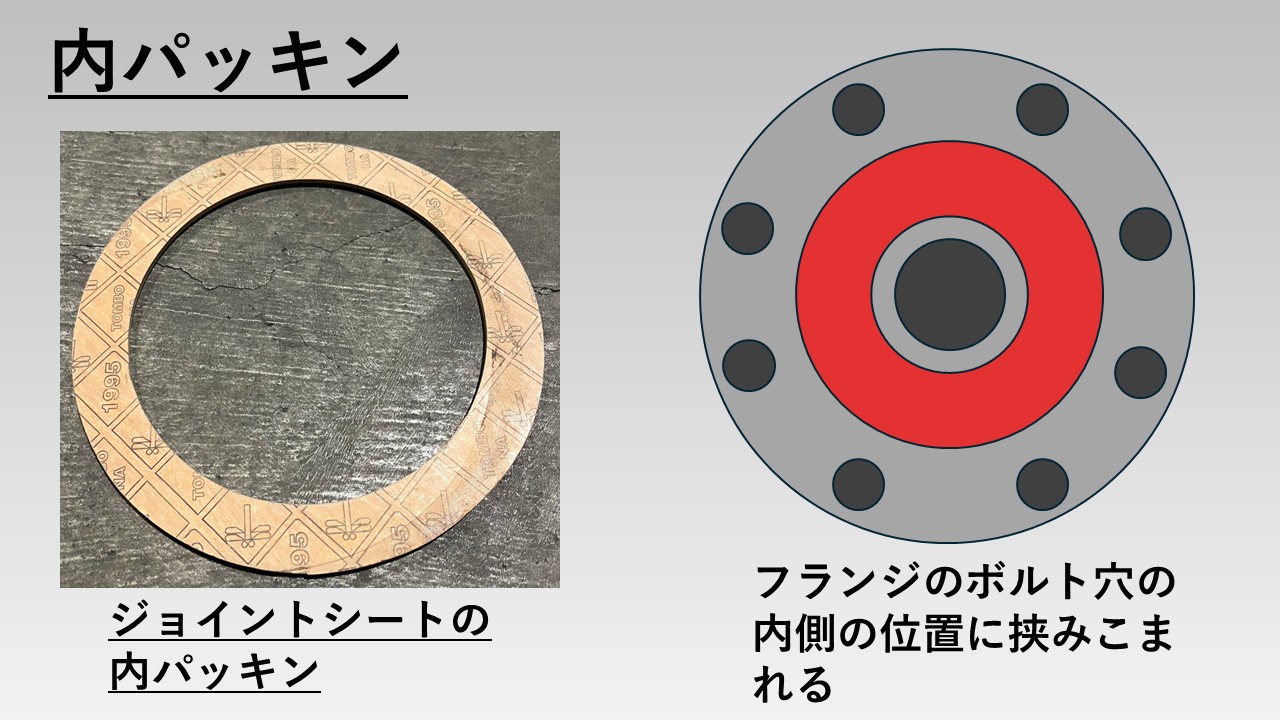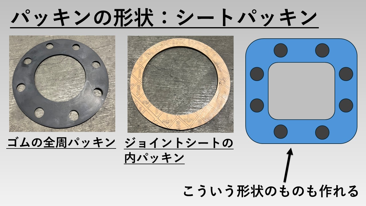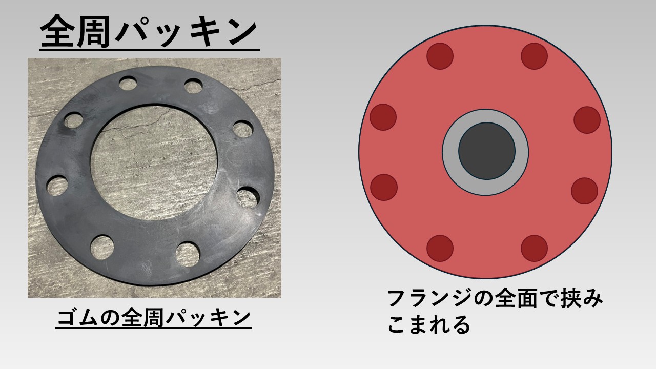 - フランジ用のシートパッキンには「内パッキン」と「全面パッキン」が存在する