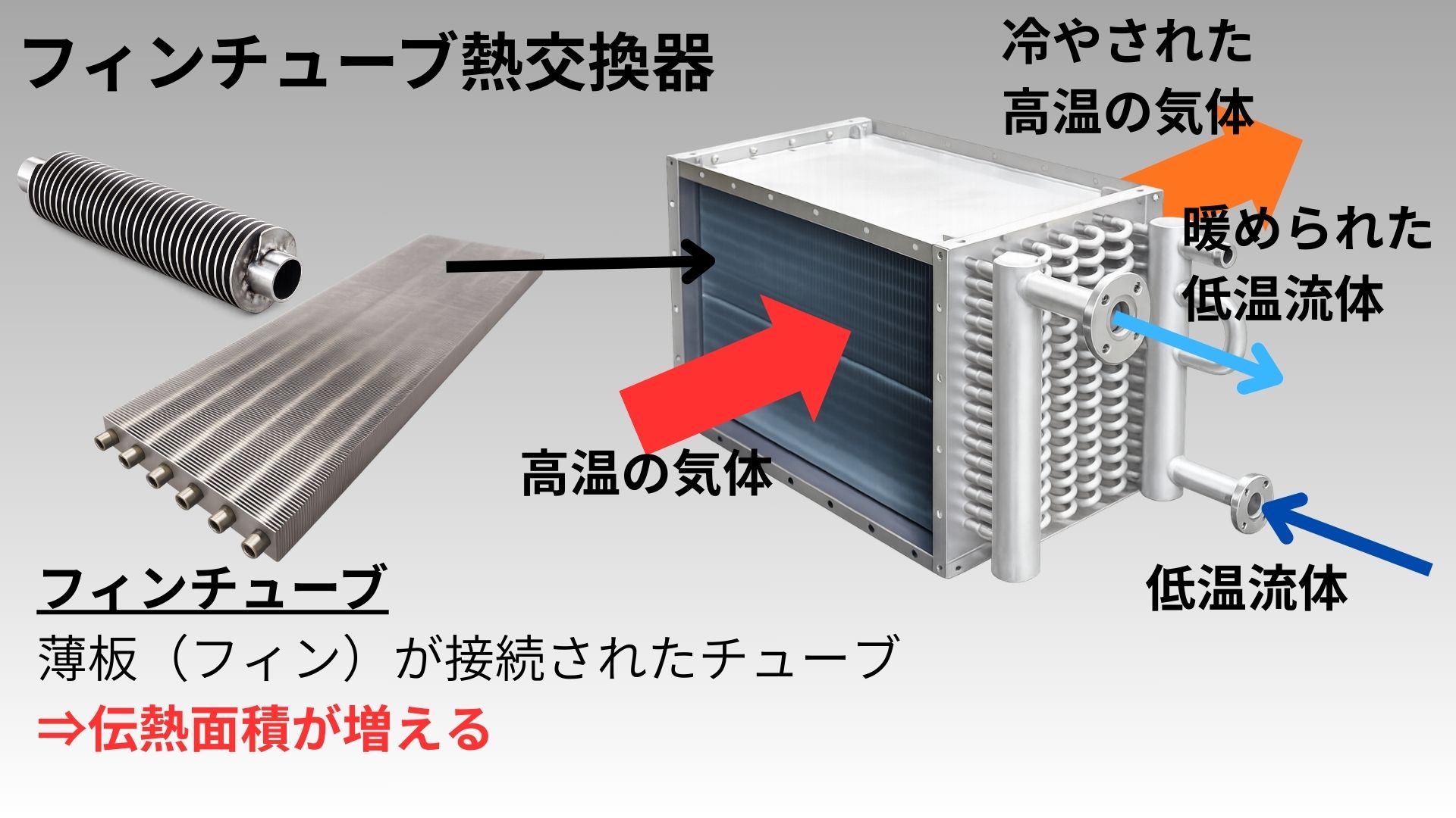 • 気体との熱交換が得意: フィンによって伝熱面積を稼ぐことで、熱が伝わりにくい空気(ガス)との熱交換でも効率的に行うことができる