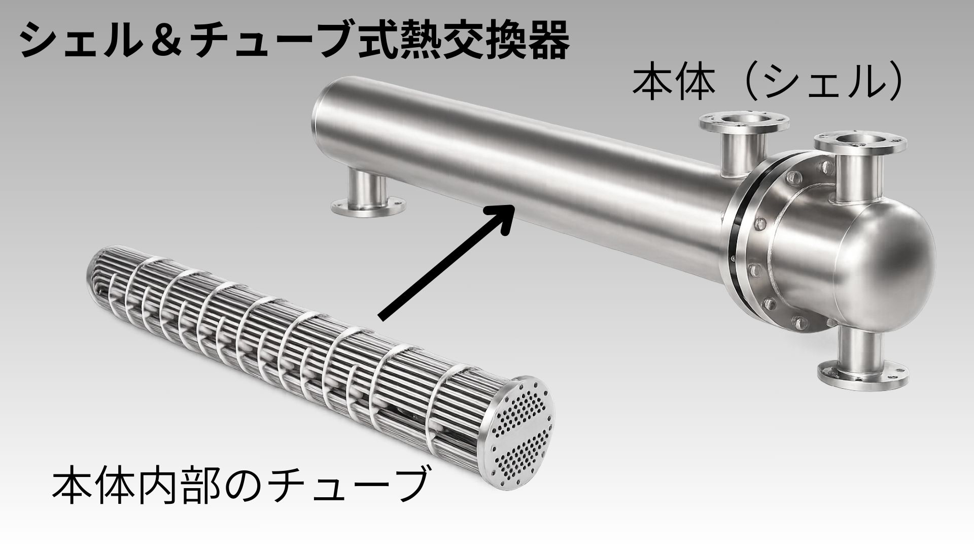 • 円筒形の胴体(シェル)の中に、多数の細い管(チューブ)を収めた構造をしている。
