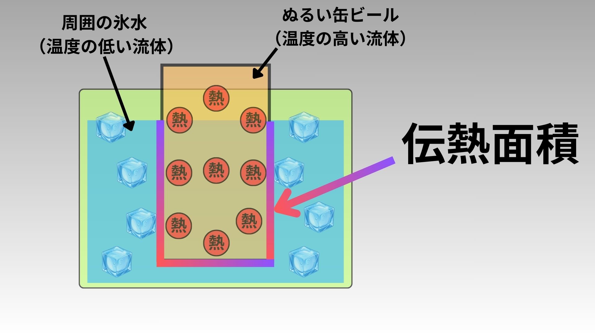 • 例えば、氷水を入れたクーラーボックスに入った缶ビールの場合、下図の部分が伝熱面積になる。