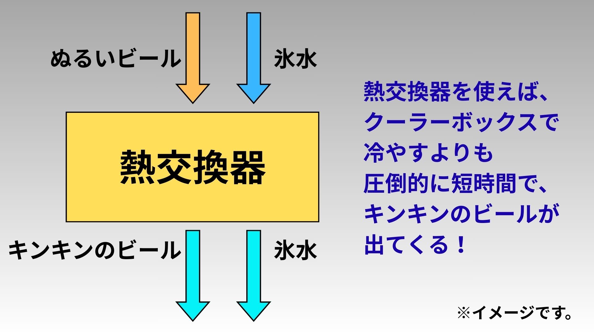 例えば、熱交換器にぬるいビールと氷水を流し込んだ場合、クーラーボックスに入れて冷やしていた時に比べて、圧倒的に短時間で、大量のビールを冷やすことが可能です。