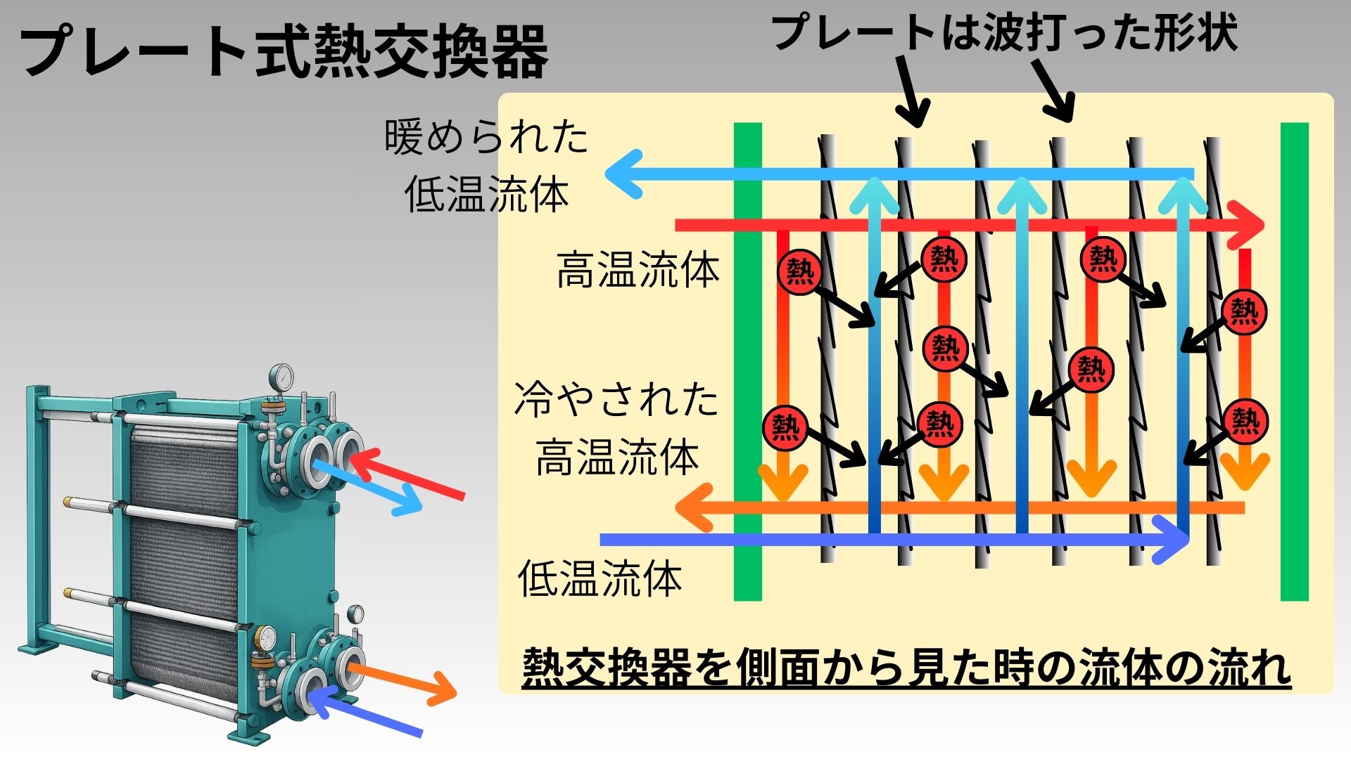 • 隣り合った高温流体と低温流体で、プレートを伝熱面として熱交換が行われる。