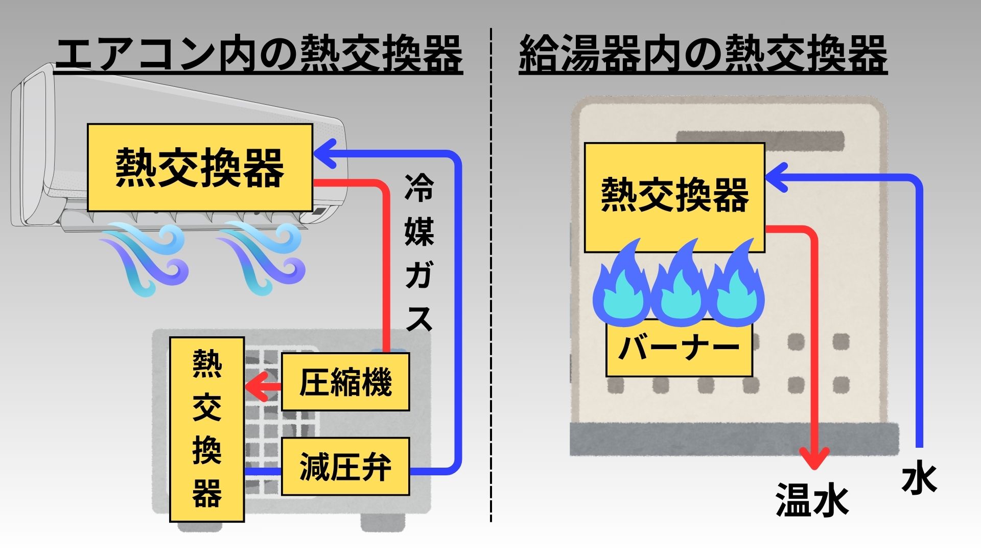 エアコンや給湯器が熱交換器ということではなく、熱交換器はエアコンや給湯器の内部で効率的に熱交換を行う内部部品であるということです。