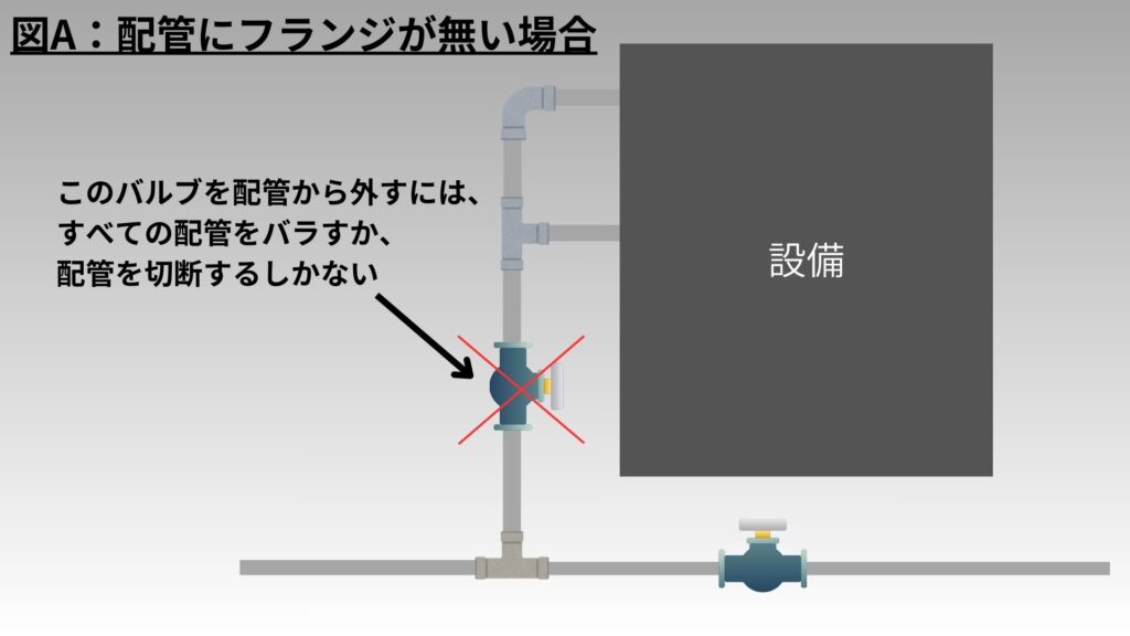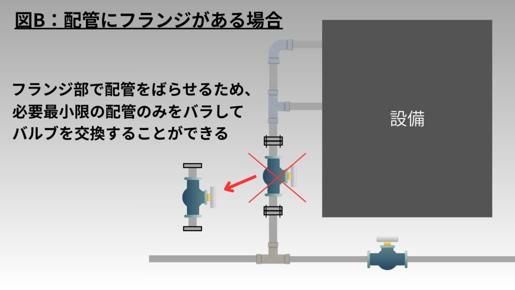 一方、図Bのようにフランジが入っている配管であれば、フランジ部で必要最小限の配管のみをバラしてバルブを交換することが可能になります。