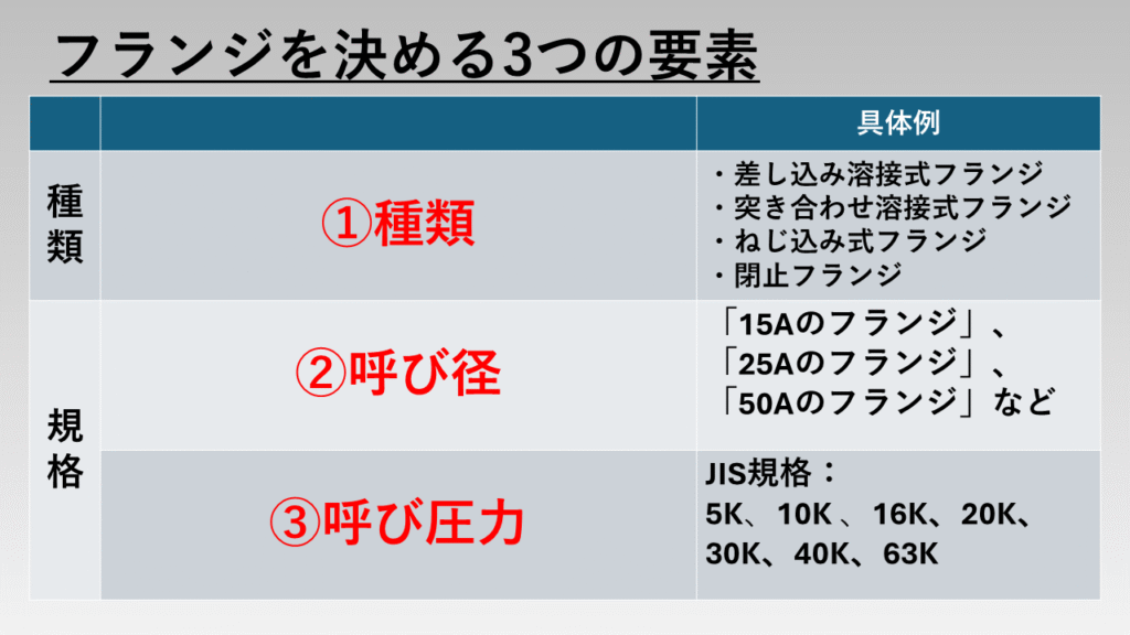 フランジの種類や規格を理解するためには、以下の「フランジを決める3つの要素」を理解する必要があります!