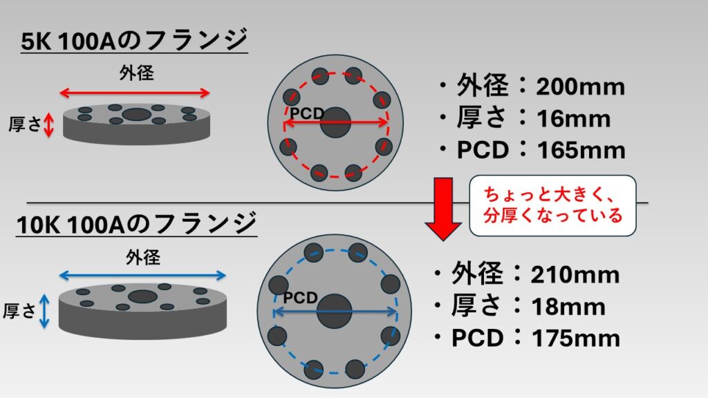 例えば、「5kで100Aのフランジ」と「10Kで100Aのフランジ」では、どちらも100Aなので100Aのパイプを取り付けることは可能ですが、下図のような違いあります。