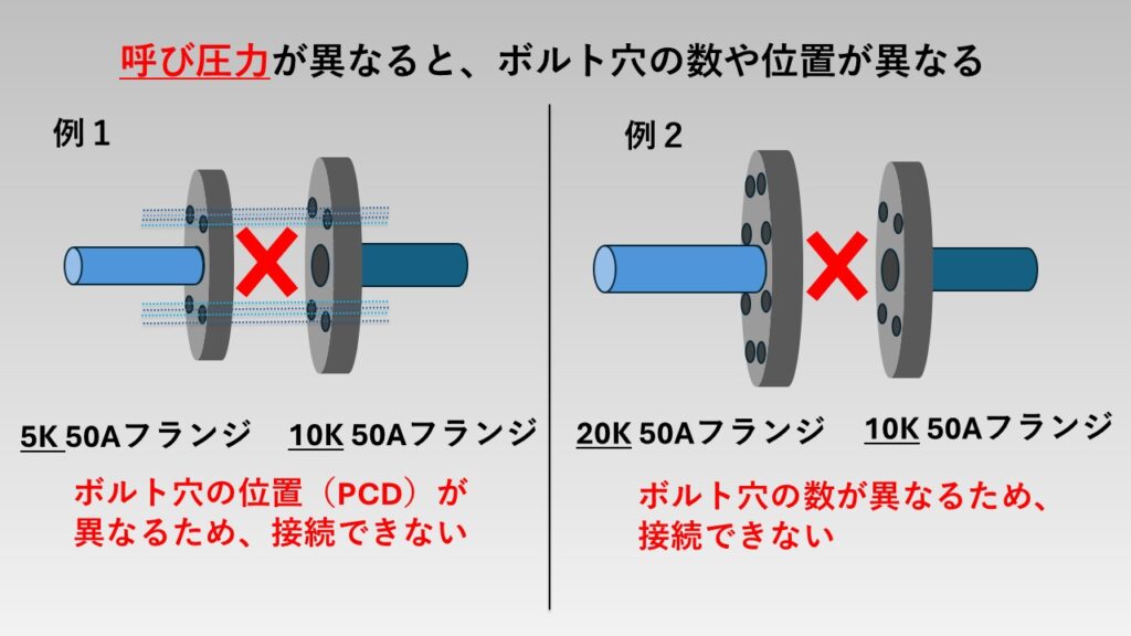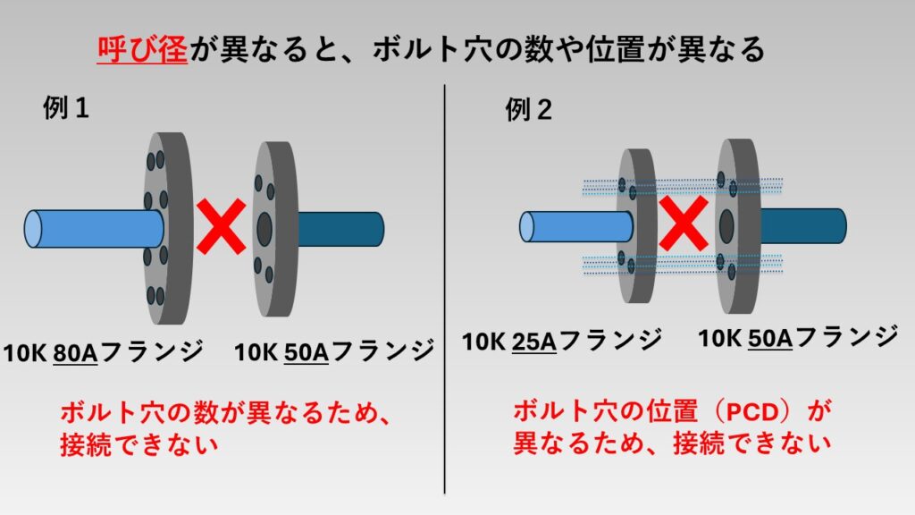 まず、「呼び径」が異なるとフランジのボルトの穴の位置や数が異なってくるため、接続できません。