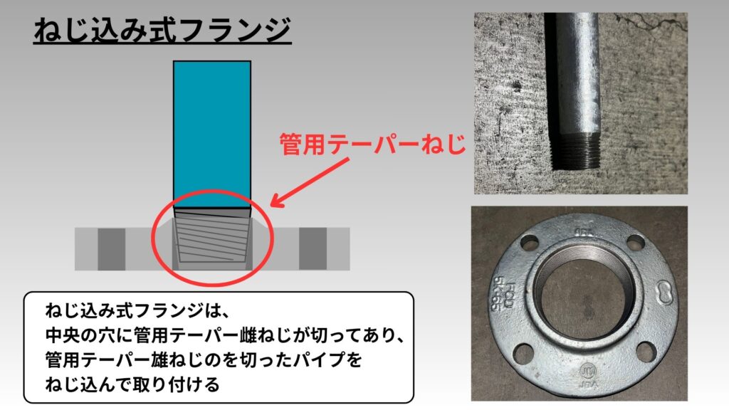 - 図のようにフランジの中央の穴に管用テーパーねじの雌ネジが切ってあり、同じく管用テーパーねじの雄ネジを切ったパイプをねじ込んで取り付ける