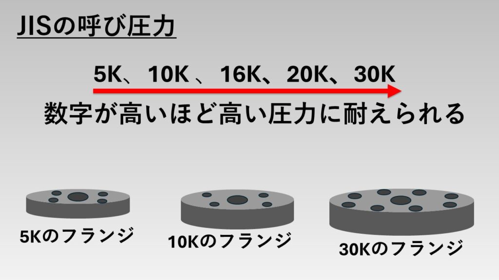 「~K」の数字が大きくなればなるほど、フランジが大きく、分厚くなり、高い圧力に耐えられるようになる。