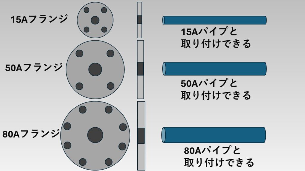 そして、「15Aのフランジ」は15Aのパイプを取り付けることができ、「50Aのフランジ」は50Aのパイプを取り付けることができ、「80Aのフランジ」には、80Aのパイプを取り付けることができます。