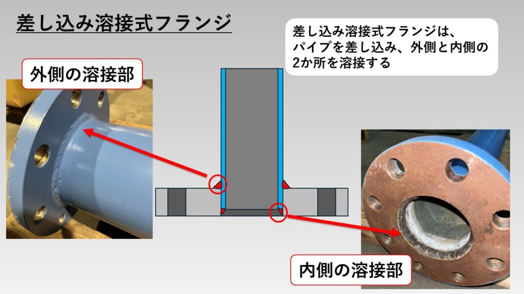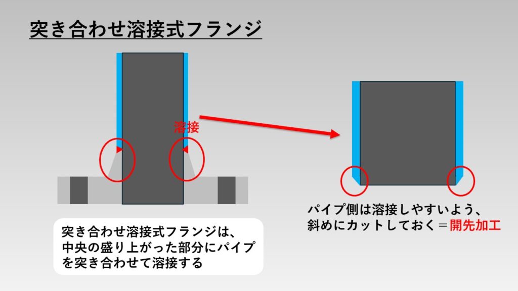(溶接がしやすいように溝や傾斜をつけておくことを開先加工という) - 差し込み溶接式フランジに比べて溶接部の強度が高い、かつ漏れにくい。