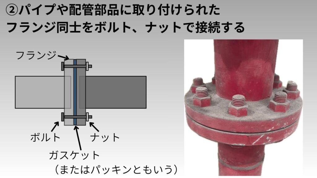②パイプや配管部品に取り付けられたフランジ同士をボルト、ナットで接続する
