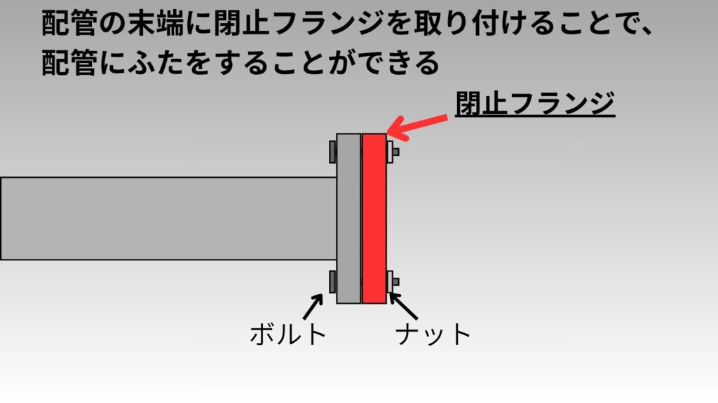 - 配管の末端に閉止フランジを取り付けることで、配管にふたをすることができる