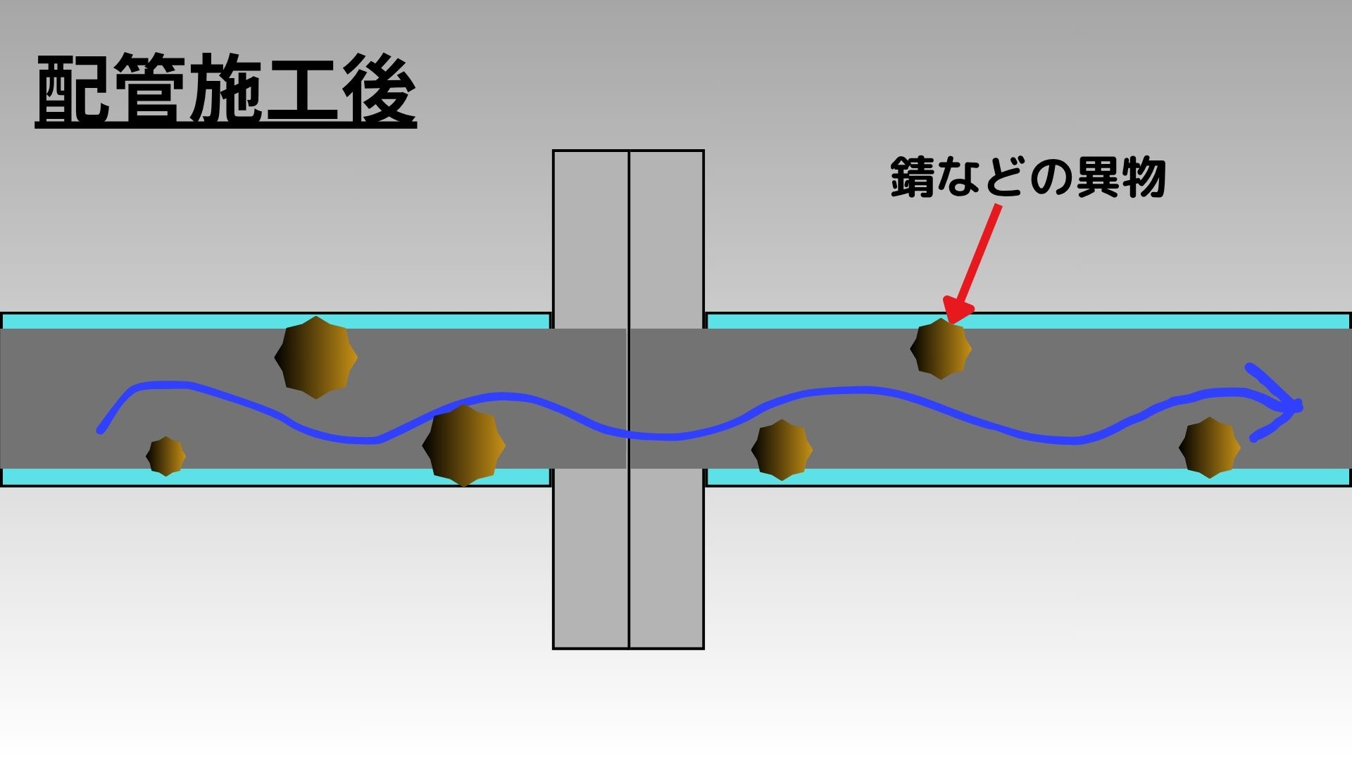 - パイプを切った際に出る鉄粉や鉄くずが配管の中に残っているため