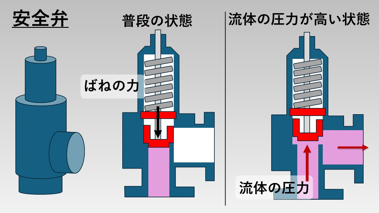 - 安全弁は、人が操作する必要はなく、流体が決められた圧力に達すると自動的に動作する