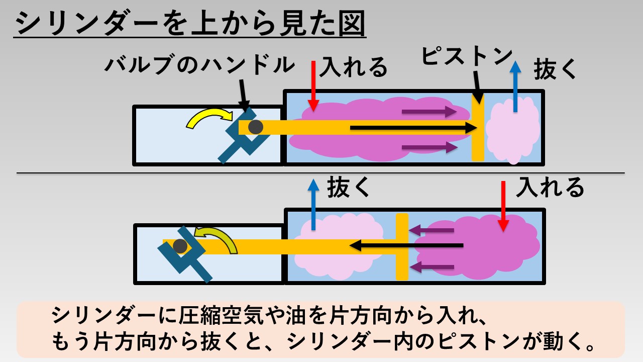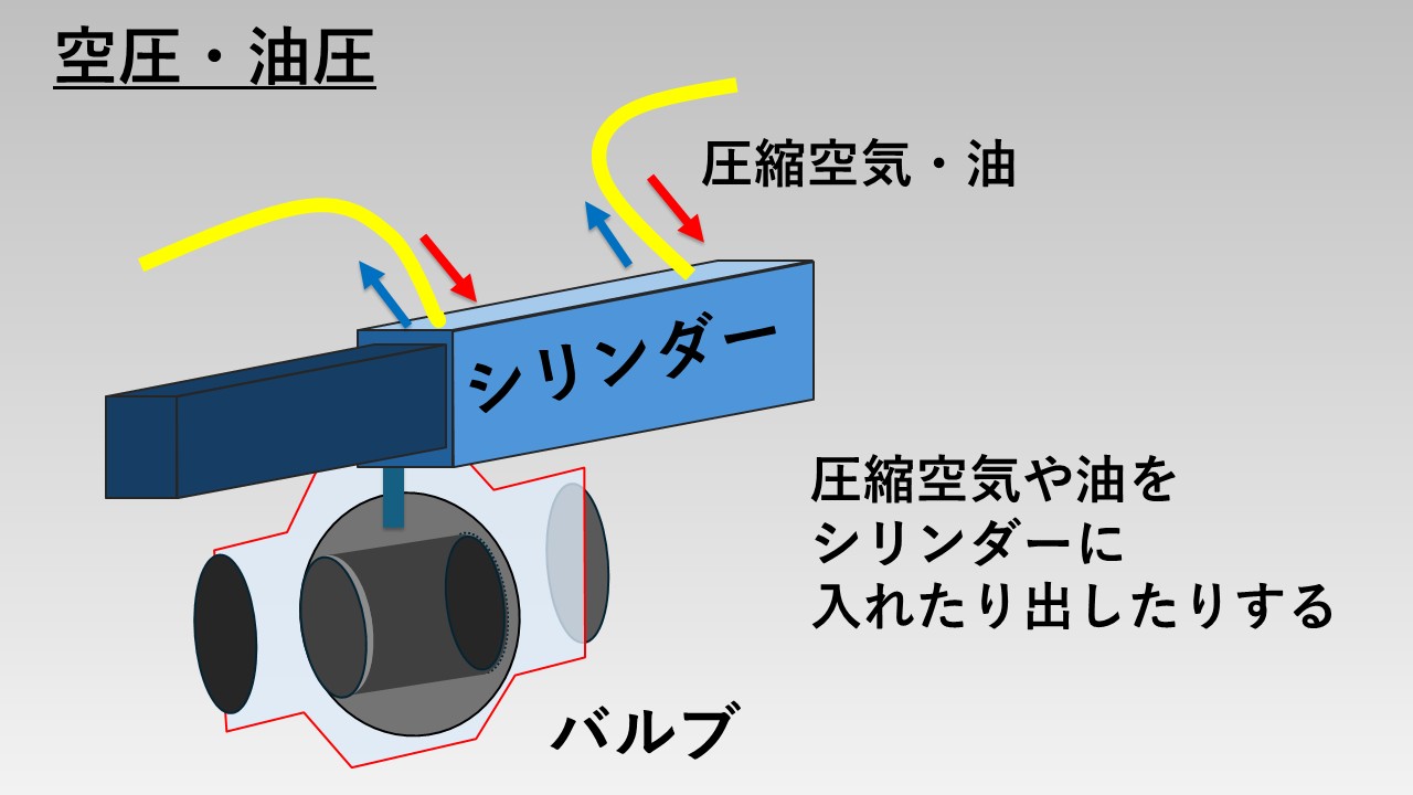 具体的には、下図のようにシリンダーと呼ばれる機器に圧縮空気(高い圧力の空気)や油を流し込み、その圧力でシリンダーが動き、バルブを動かす仕組み。