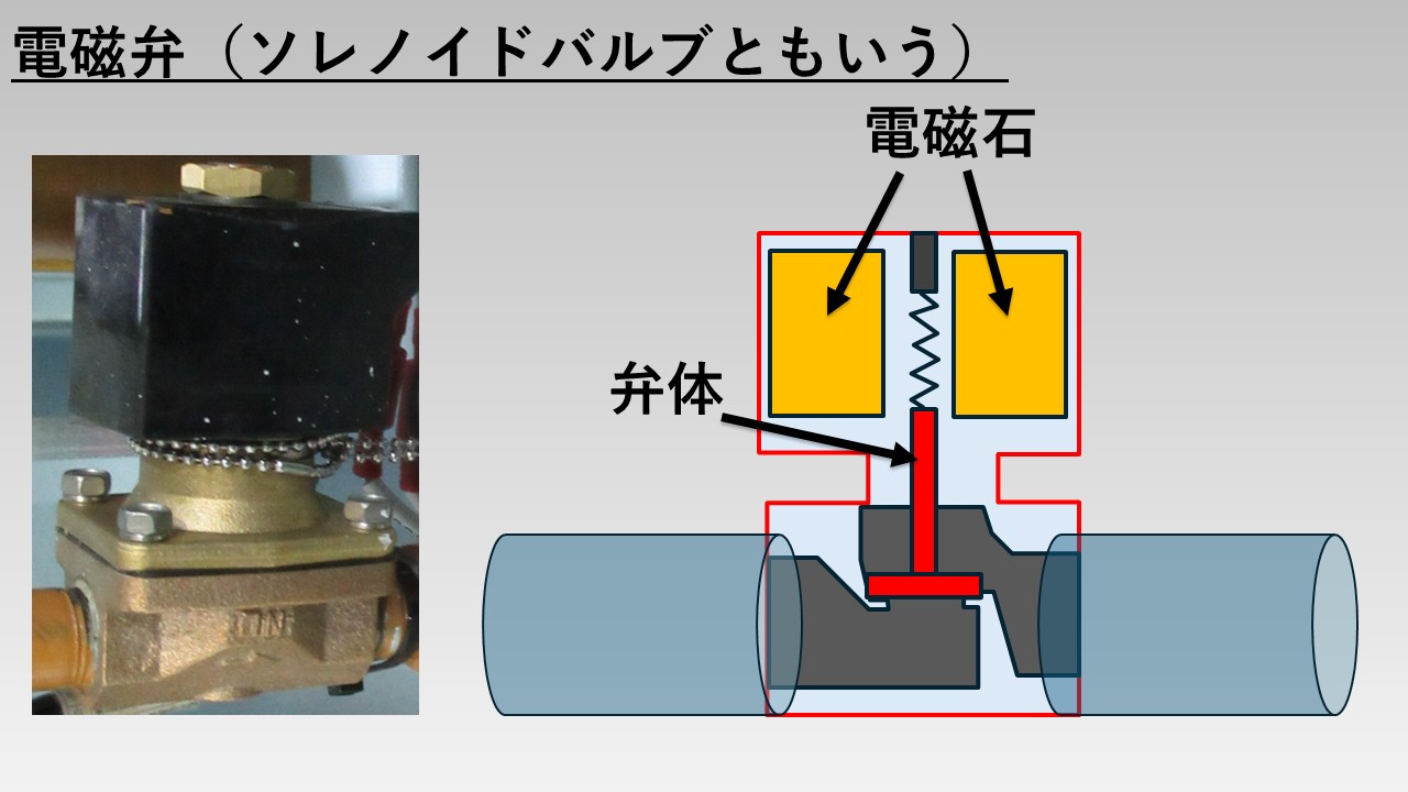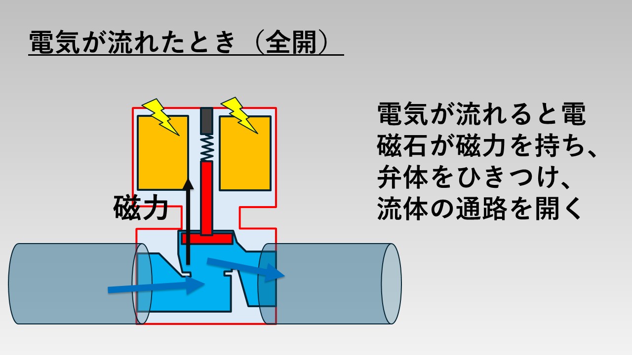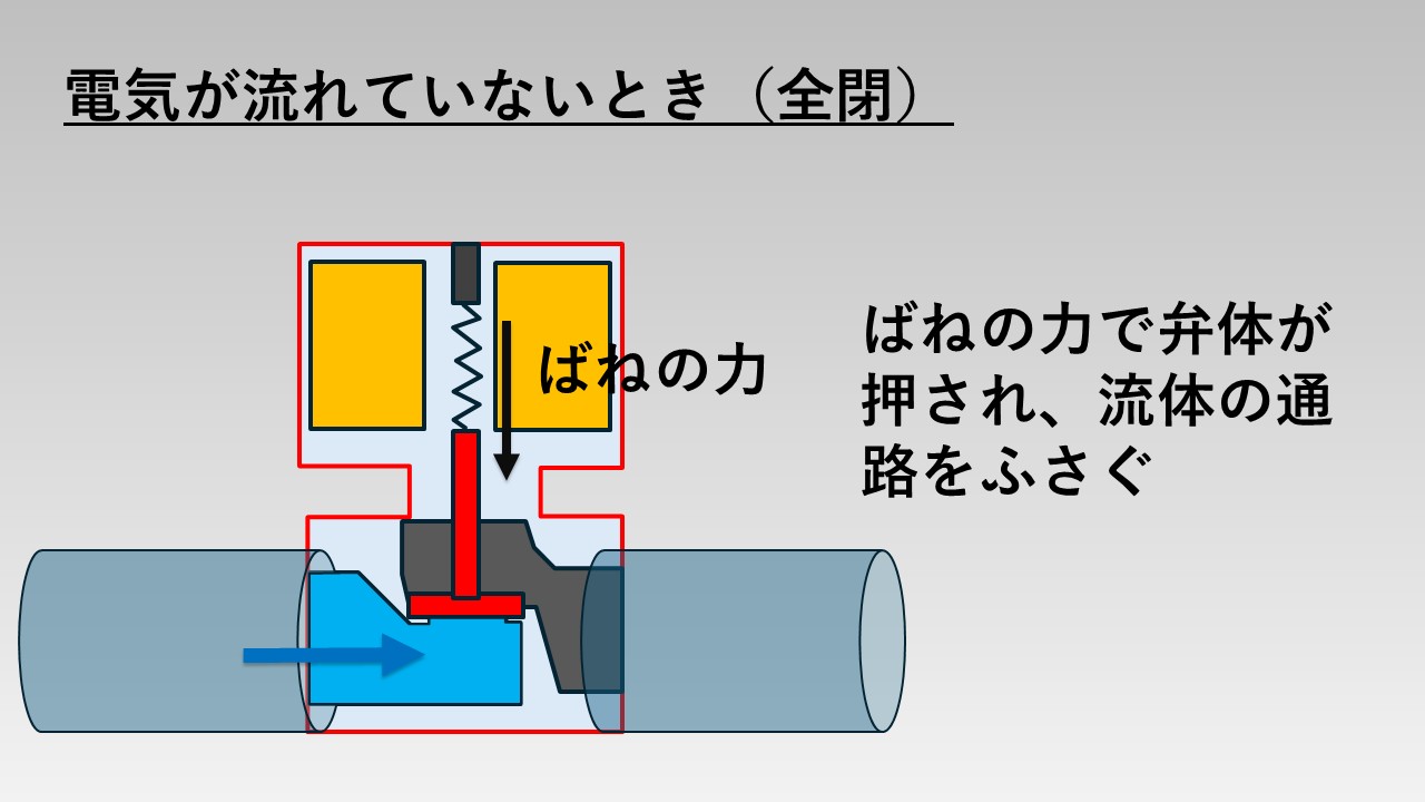 - 一方、電気が流れなくなると電磁石の磁力がなくなり、ばねの力によって弁体が流体の通路をふさぐ仕組み