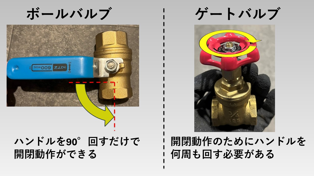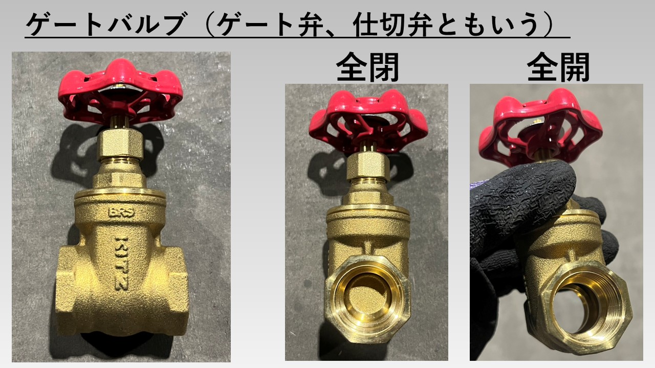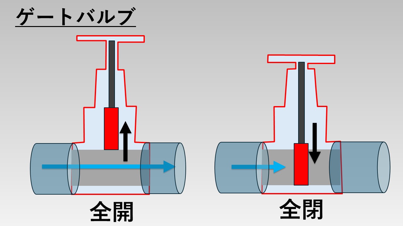 - ゲートバルブはハンドルを何回転もさせないと開閉動作が行えない