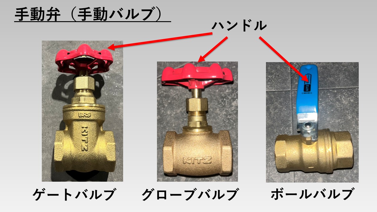 - (流体自体の力で動くバルブや電磁弁を除いた)ほぼすべてのバルブに手動タイプが存在する