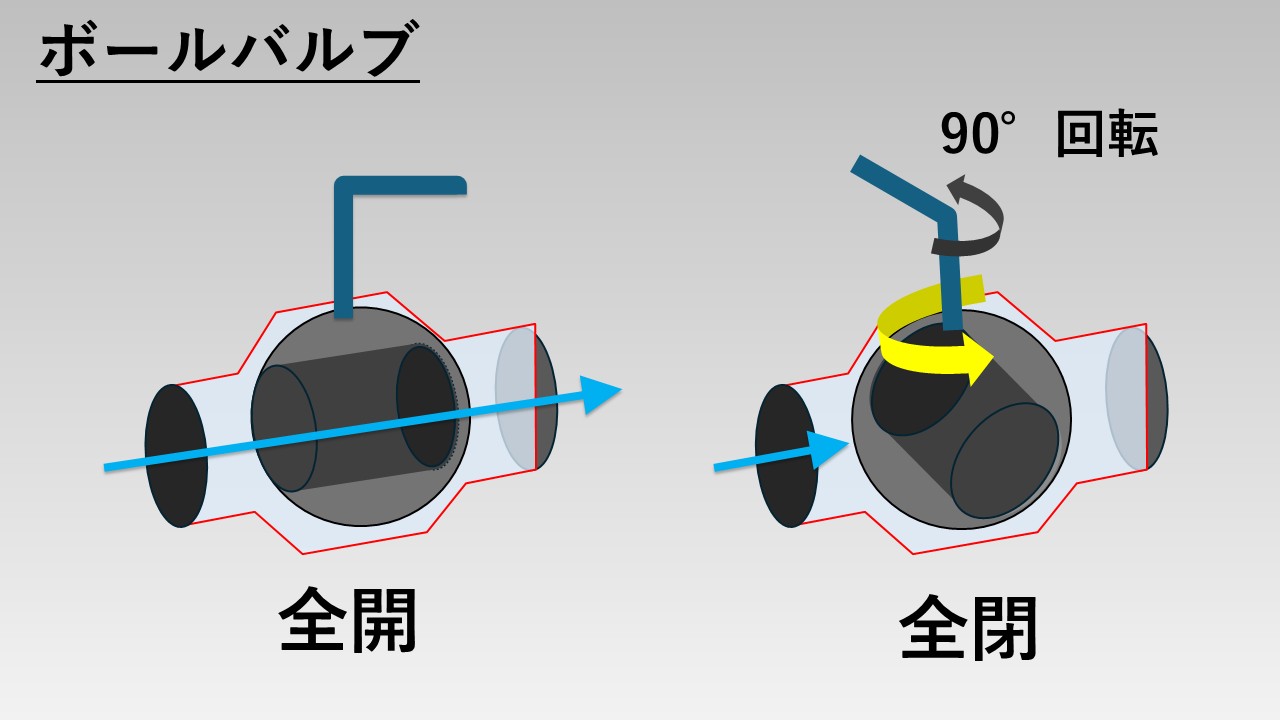 - ボールバルブはハンドルを90°回転させるのみで開閉動作が行える