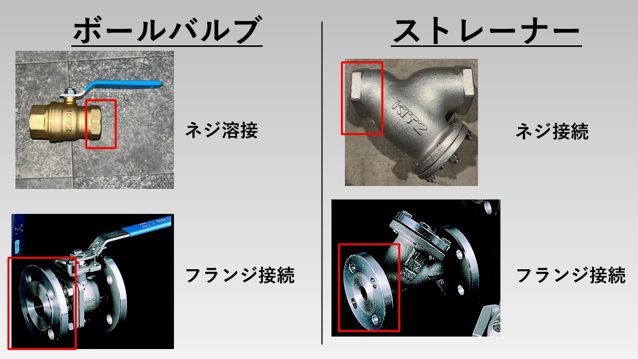 例として、ボールバルブとストレーナーの写真を載せます。同じ種類のバルブでも接続方法の違いによって、接続口の形状が異なることが分かると思います。
