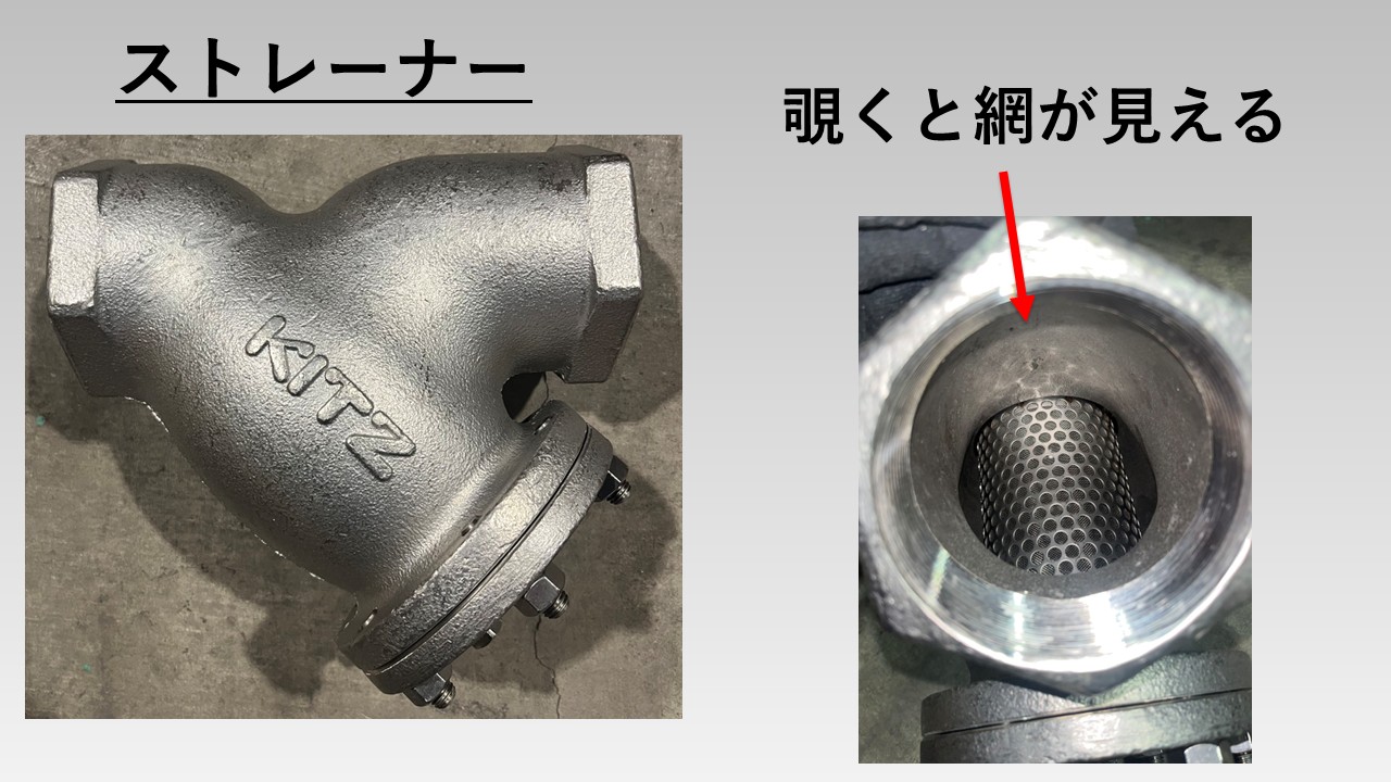 - 配管内の流体に混じった異物を取り除くために使用される。
