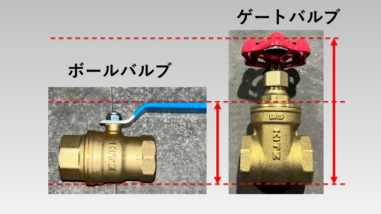 - ゲートバルブは弁体を上に引き上げるため、背が高い形状になっている