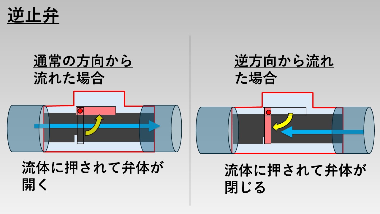 - 逆止弁は、人が操作する必要はなく、流体が逆流したときに自動的に動作する