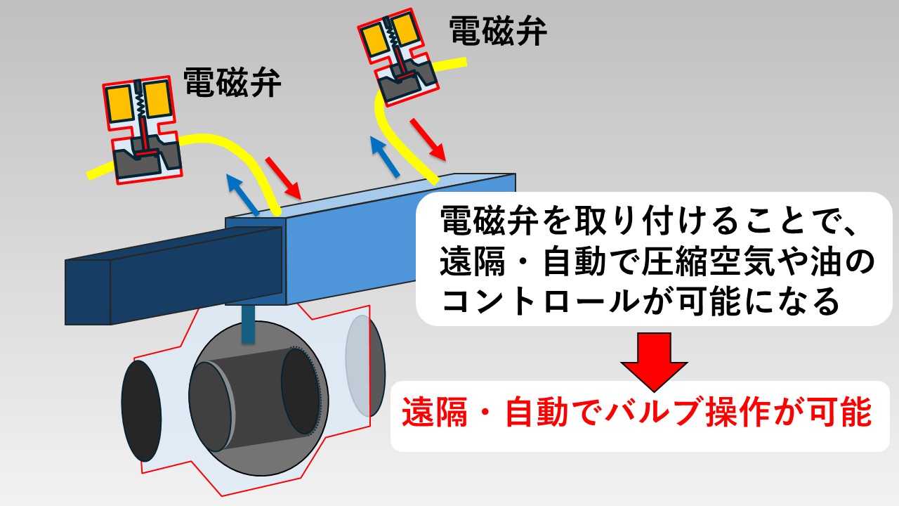 空気圧や油圧の力を使ってバルブを動かす方法です。