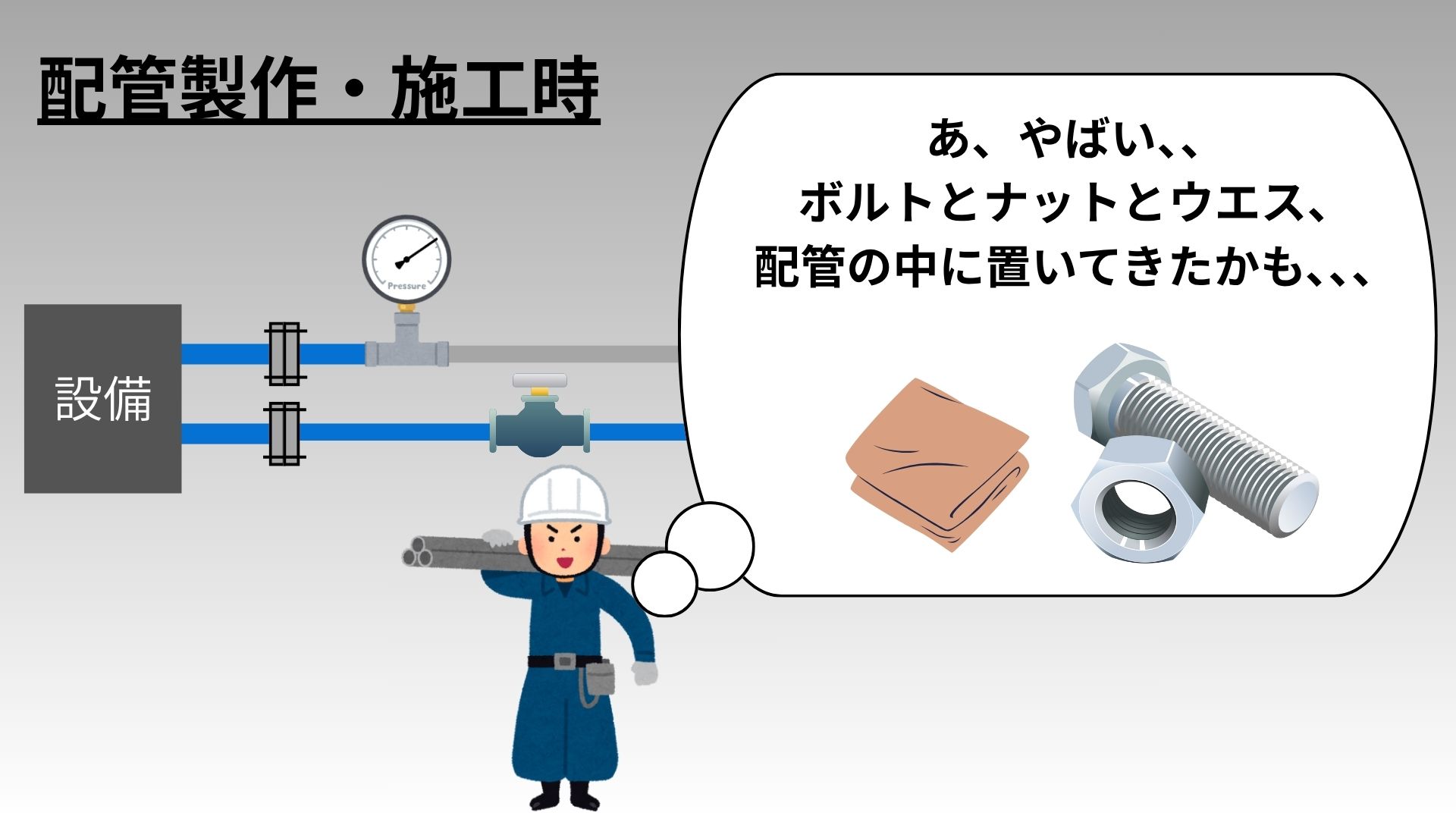 - 施工時に誤って配管内にウエス(布)やボルト、ナットを置いてきてしまうため