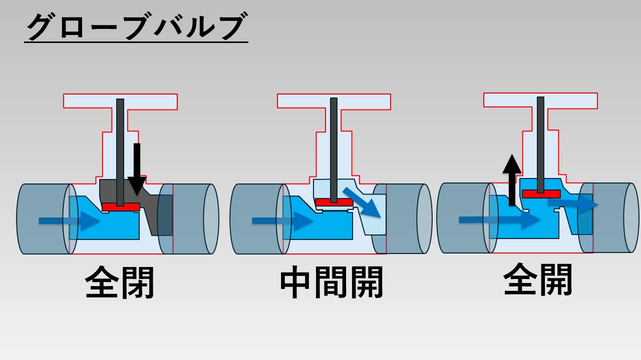 - グローブバルブ(グローブ弁、玉形弁ともいう)